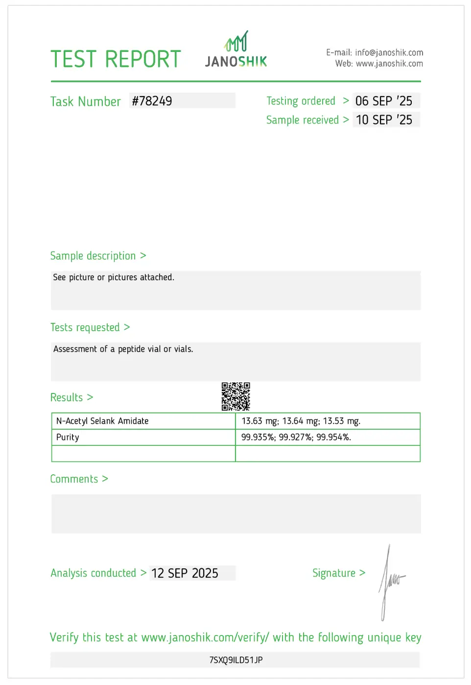 With enhanced delivery, prolonged activity, and improved absorption, N-Acetyl Selank Amidate stands as a premium neuro-research compound—supporting exploration into cognitive function, emotional balance, and advanced neurological signaling.